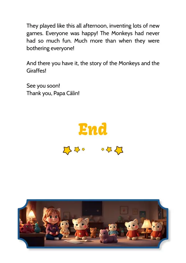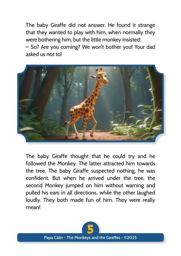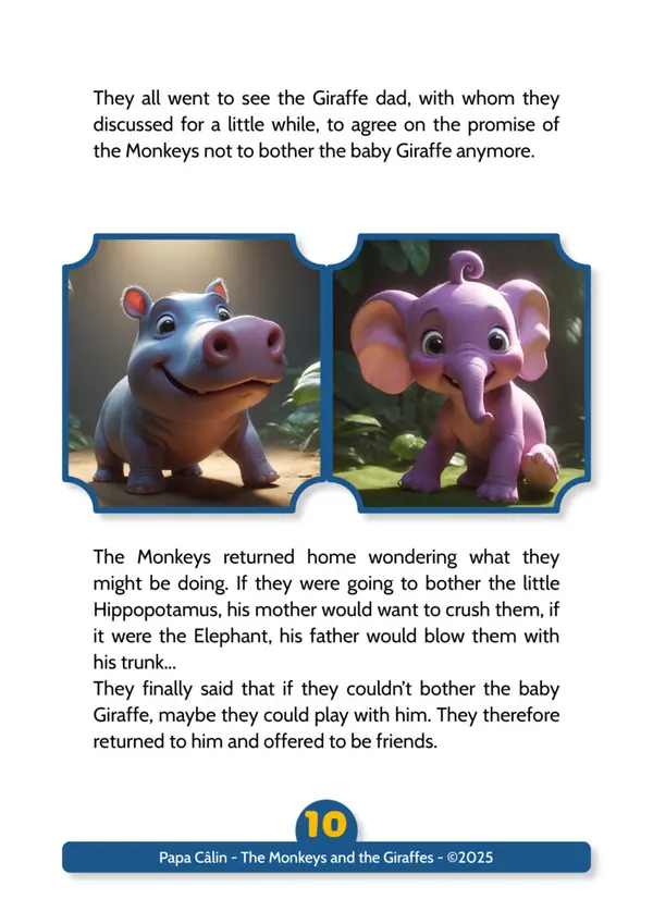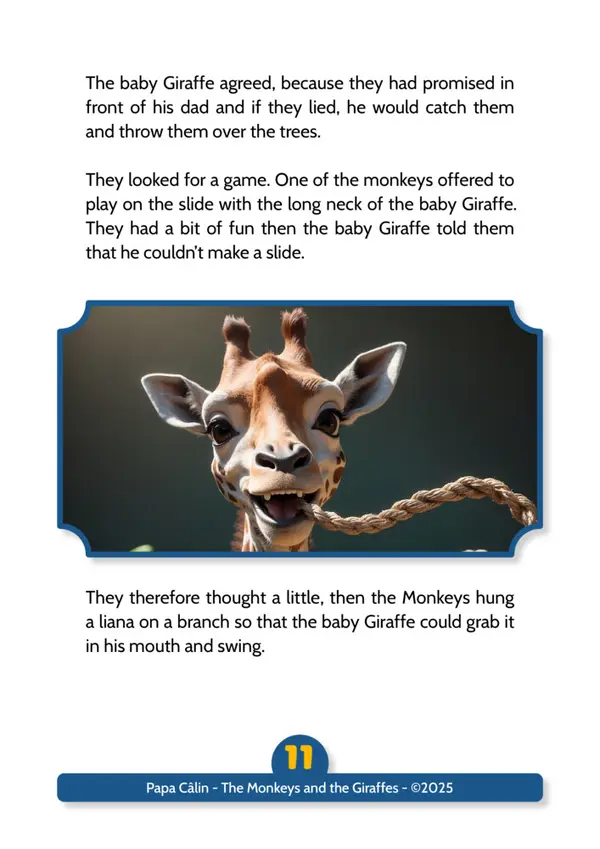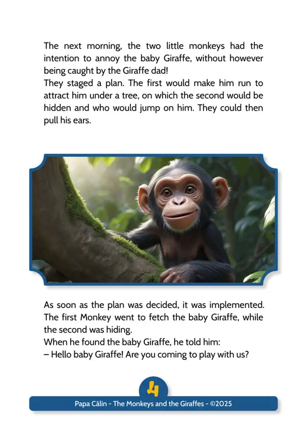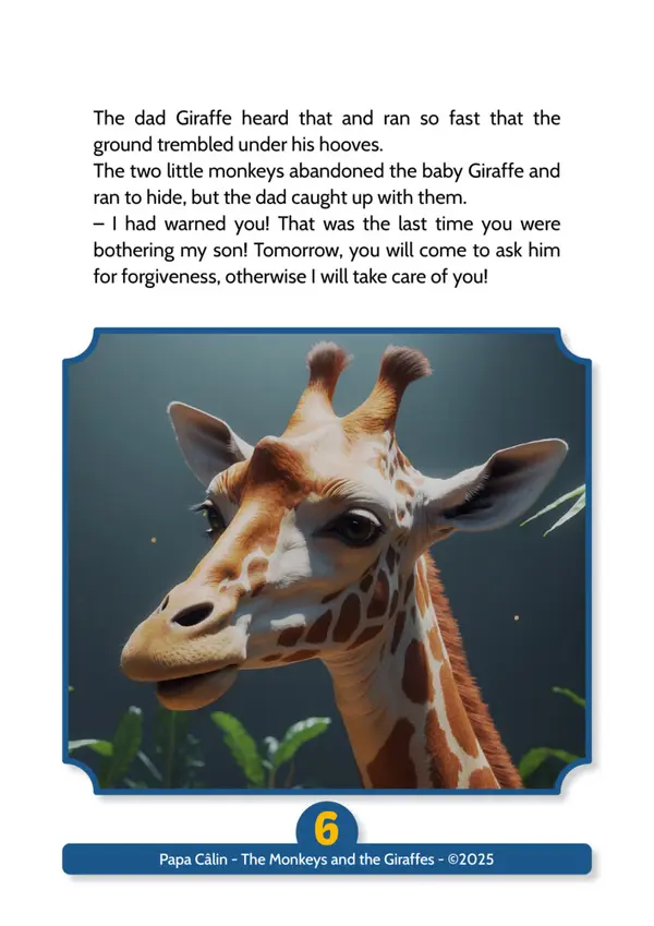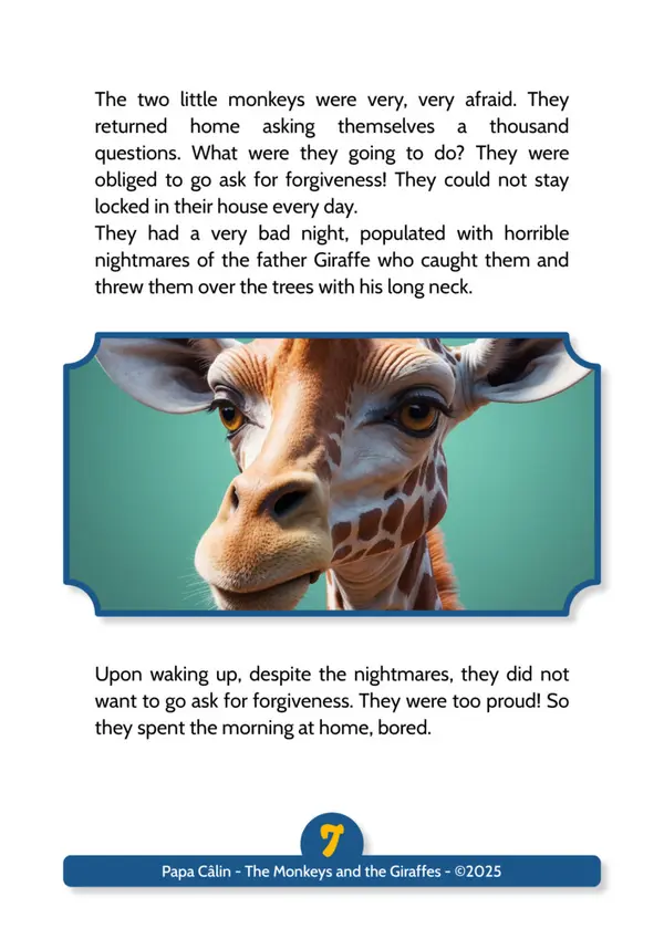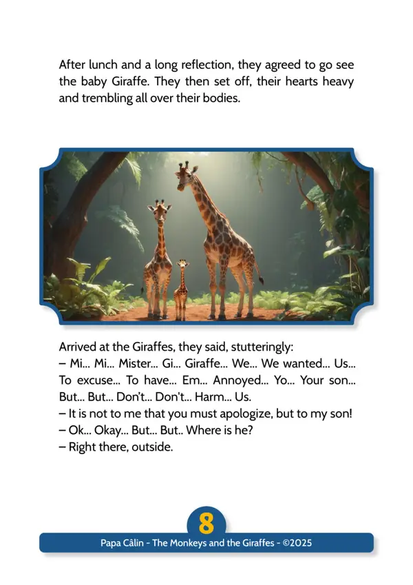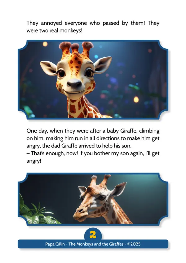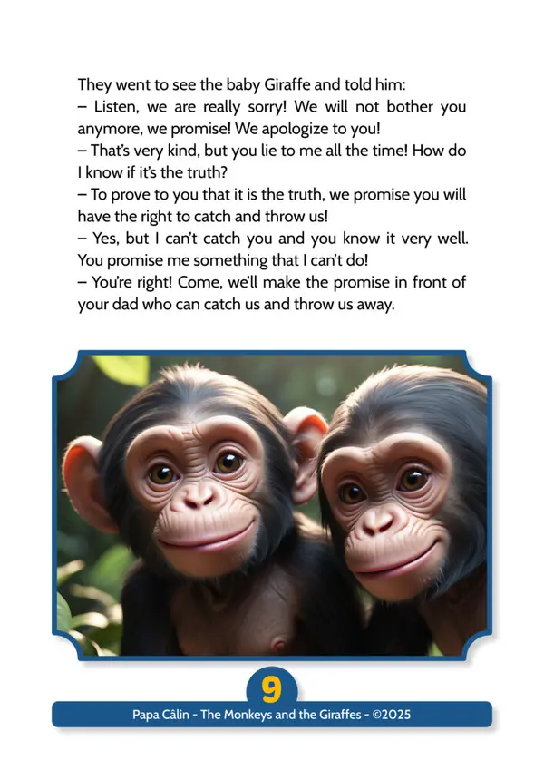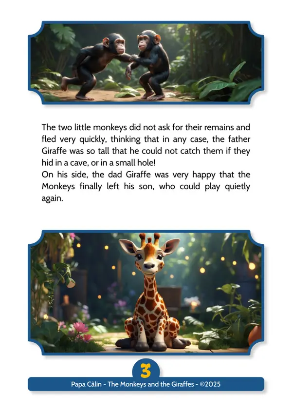 A story by Papa Câlin with the Monkeys and the Giraffes, where we discover that troublemakers can evolve when confronted with their facts.