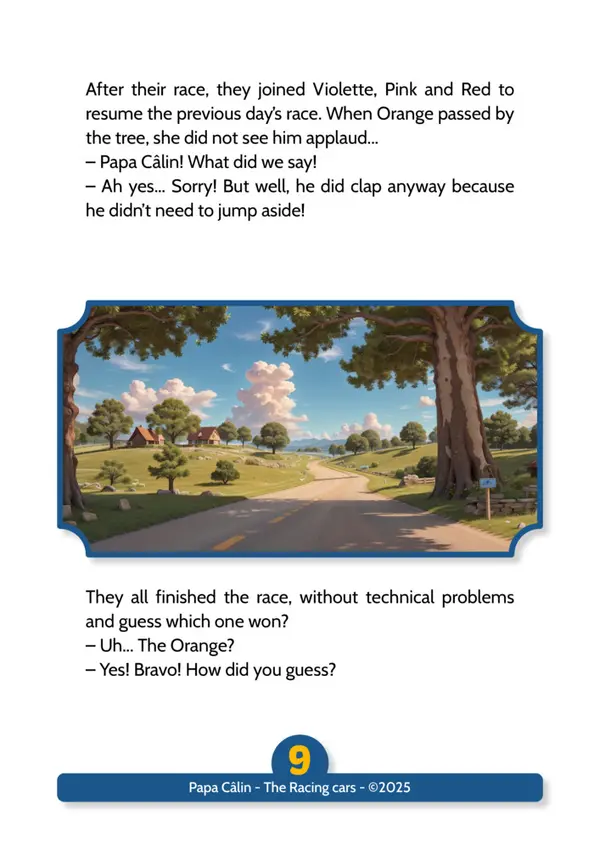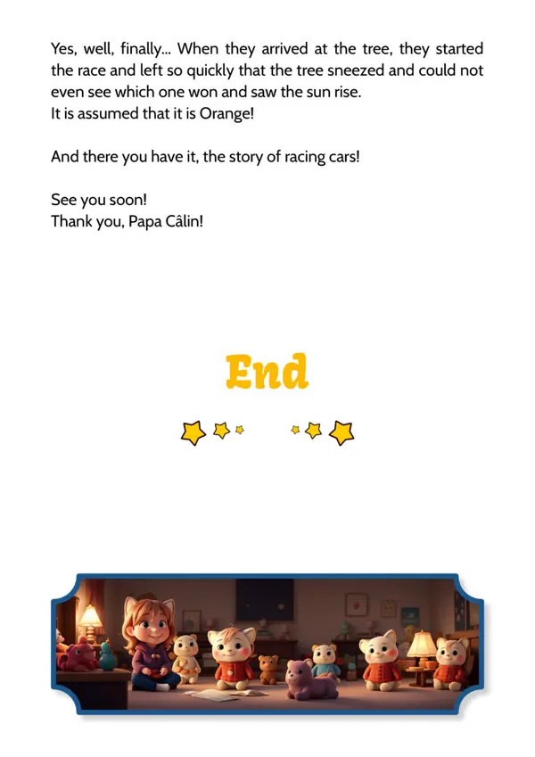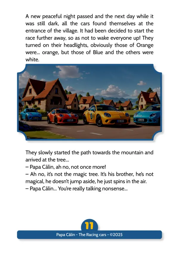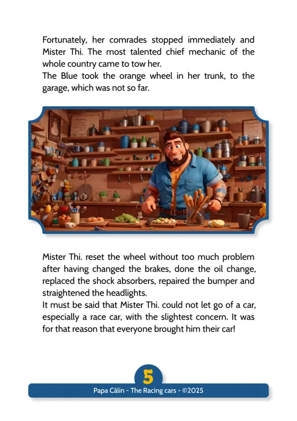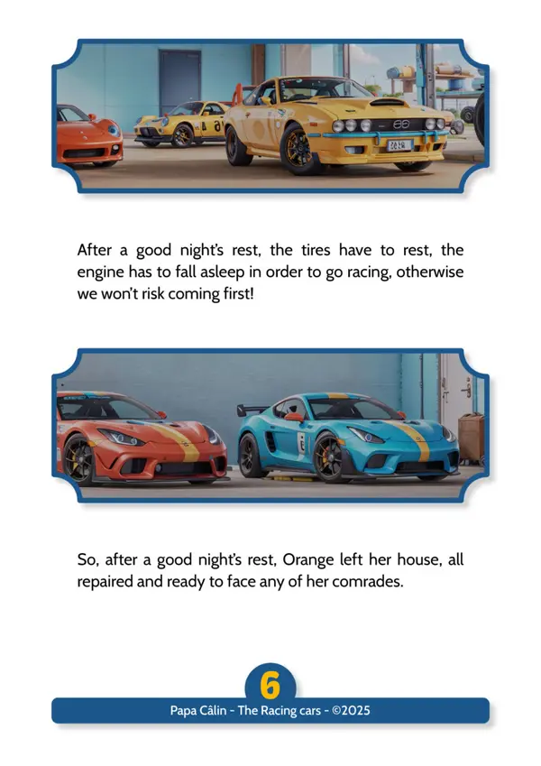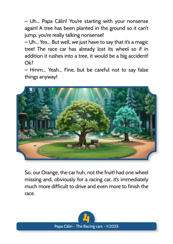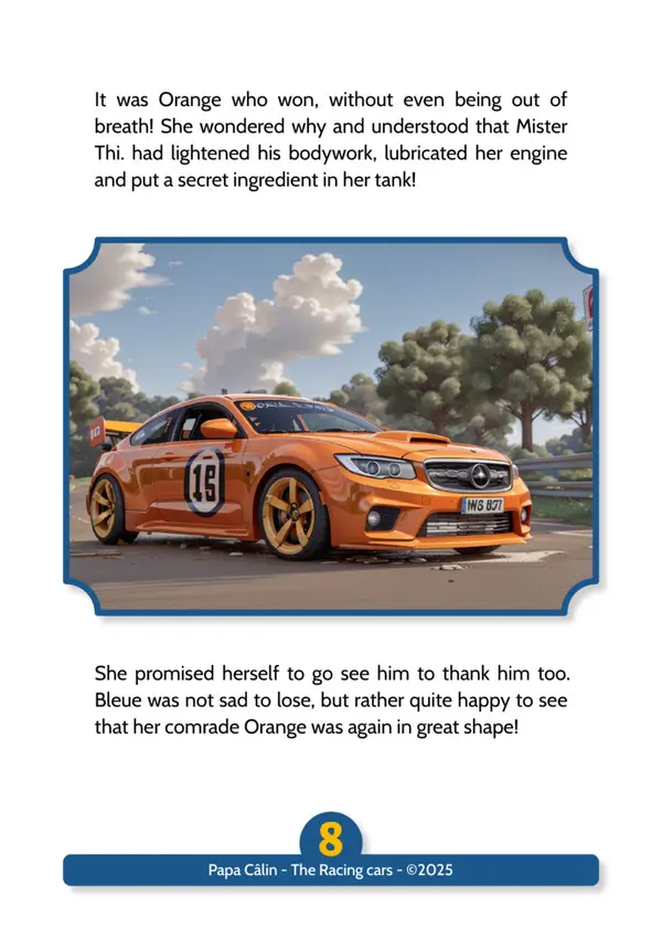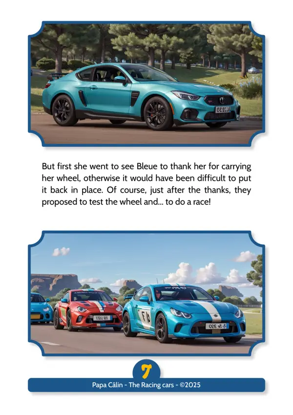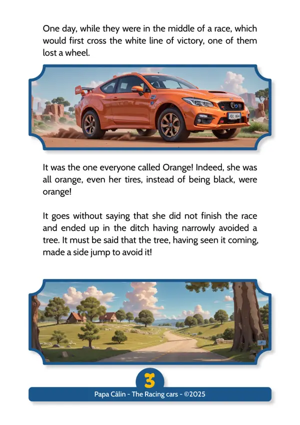 A story by Papa Câlin with racing cars, where we discover that even race cars can lose a wheel.