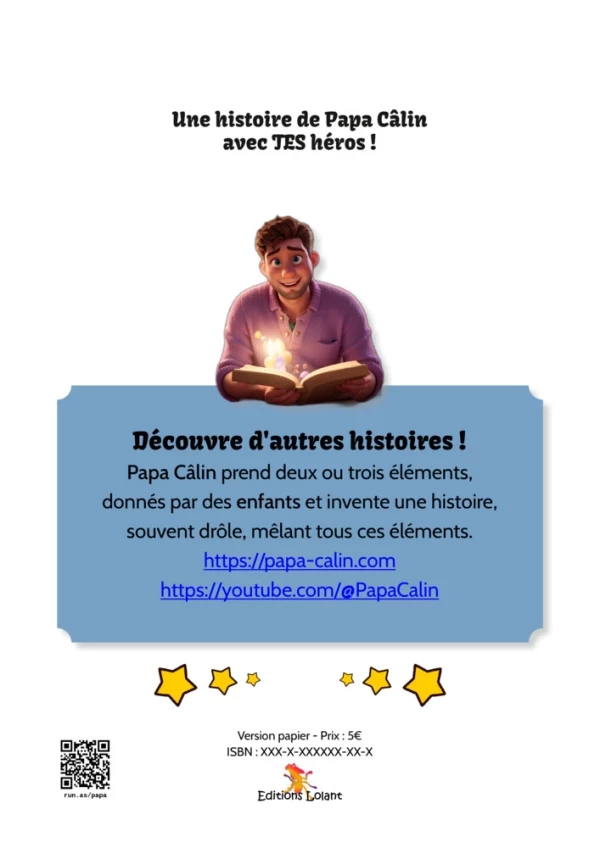 Tu souhaites que papa Câlin invente TA propre histoire ? Avec TES propres héros ? Alors, tu es au bon endroit ! Commande TON histoire !