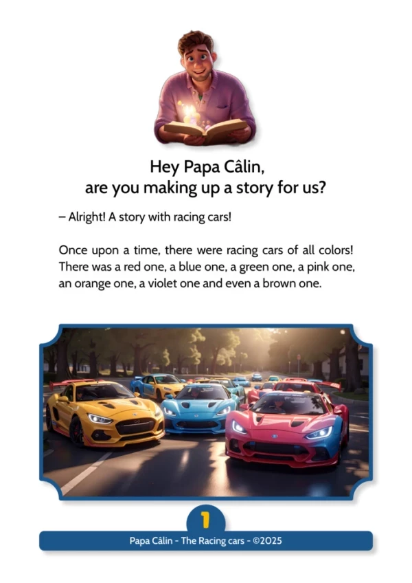 A story by Papa Câlin with racing cars, where we discover that even race cars can lose a wheel.